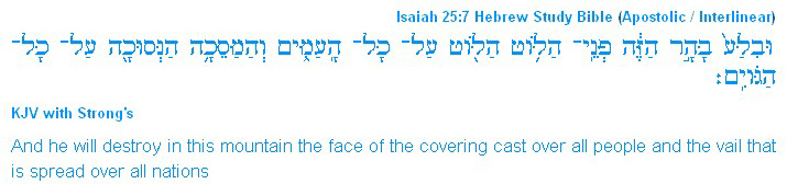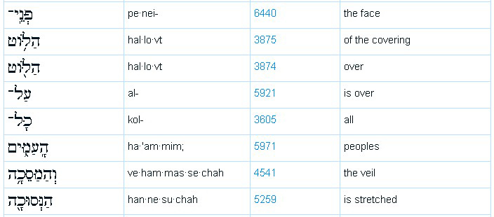 The King James renders the Hebrew "paneh" (pe-nei) [Strong's #6440] as "the face" but it has with it the connotation of anger, against, before, defiant among other definitions. The Hebrew word translated as "covering" is the word "lot" or "lut" (hal-lo-vt). There's not much to go on with that word by itself. But notice the same word repeats itself in the sentence [Strong's #3875 (lot) and Strong's #3874 (lut)]. This carries the notion that it is a tightly wrapped covering or envelope that is apparently surrounding the earth. The word "meccekah" (mas-se-cha) [Strong's # 4541] translated as "the veil" indicates that it is "a libation, molten metal or image." A libation is a ritual drink offering to a god or spirit in memory of the dead. And the word "nasak" (naw-sak" [Strong's #5259] translated as "stretched" means "to weave" as in to spread as something interwoven... like a web. So, what we have here is something metal tightly wrapped around the earth that seems to be facing it or opposing it, woven like a web. Could this be a prophetic vision of the wire entangled globe we call the World Wide Web? A creation that enables "faces," imagery and information to beam at our faces through our computer monitors? Is this how the False Prophet gives power to the "image of the Beast" in the Book of Revelation?
