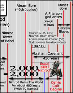 Ha! The Bible just gave you a big clue as to what's going on here. Eber is the man whose name is that from which we get the term "Hebrew." Eber had a son named Peleg - so named because it was in his days that the earth had been divided (at the Tower of Babel). After Eber had Peleg, he lived 430 years. What happened in those 430 years? Nimrod ruled as king of the world! In Egypt, he was known as Osiris. As we have already seen, Osiris was known as the King of kings and Lord of lords! So, what we see here is a king over the whole world, who eventually left his first capital (in Babylon) and set up his new headquarters in Egypt! So, in essence, what we have in the Exodus scriptures is an accurate statement by the time God says that to Abram. Now, let's see how this played out.