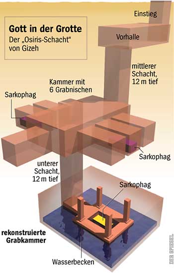 "I have found a shaft, going 29 meters vertically down into the ground, exactly halfway between the Chefren Pyramid and the Sphinx. At the bottom, which was filled with water, we have found a burial chamber with four pillars. In the middle is a large granite sarcophagus, which I expect to be the grave of Osiris, the god…I have been digging in Egypt’s sand for more than 30 years, and up to date this is the most exciting discovery I have made…. We found the shaft in November and began pumping up the water recently. So several years will pass before we have finished investigating the find."