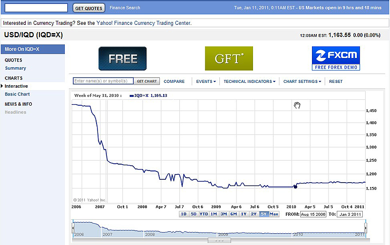 It is a little confusing when you first look at this chart because I used the word "appreciated" and yet you see the graph falling. What you are looking at is the value of the Dinar as compared to the U.S. Dollar. The Yahoo Finance web site only allows you to go back 5 years. But still, you can see that in August of 2006, the Dinar was worth about 1,500 to 1 USD. In 2009, it leveled off at roughly 1,170 to 1. As of this writing, you can see that it has crept down (up in value) to 1,163 to 1. So, even left to grow on it's own it has appreciated steadily in value since 2003. This has been largely due to our efforts in helping to stabilize the country of Iraq. And it is STILL appreciating in value.